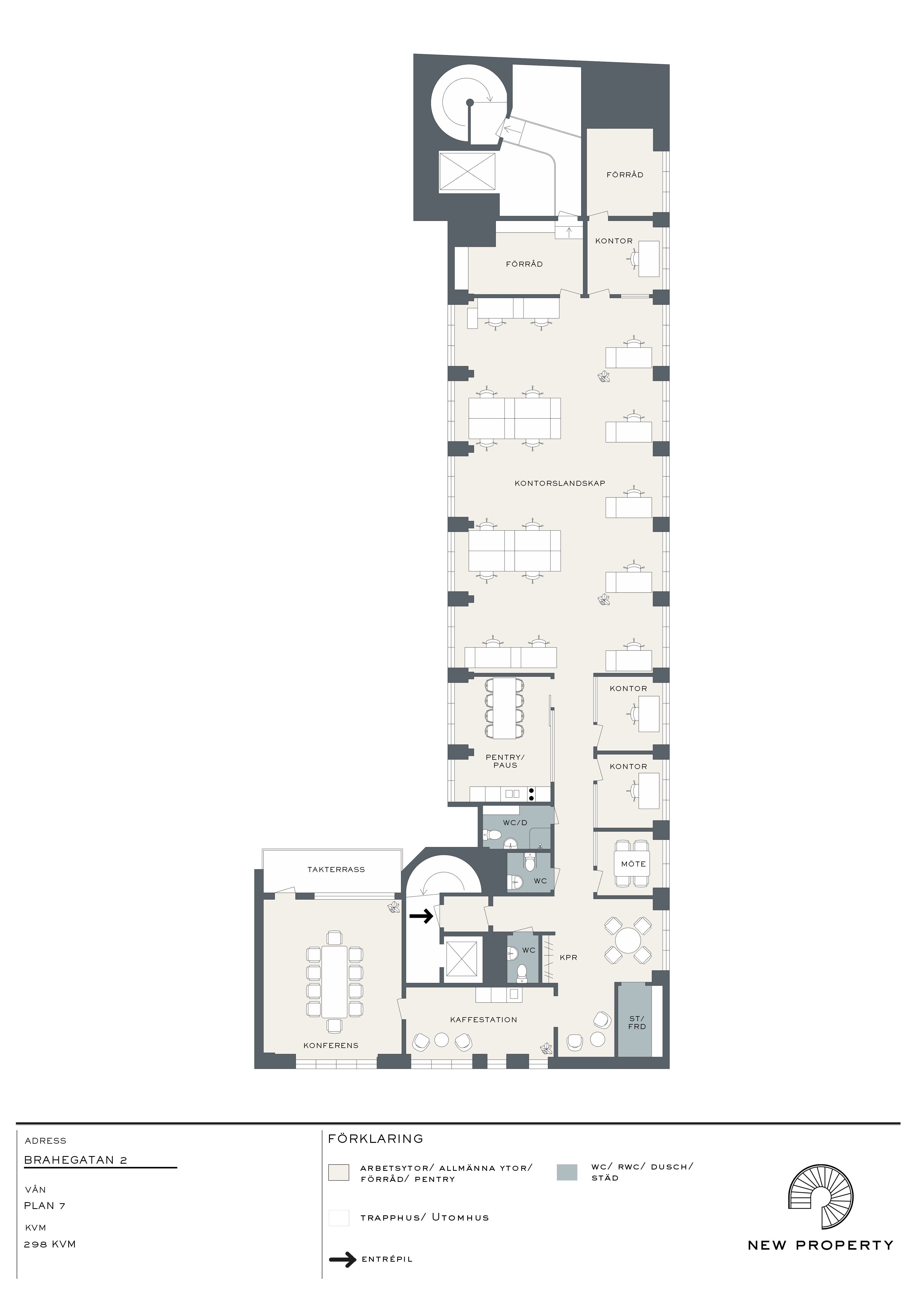 Planlösningen kompletteras med en rymlig konferensdel, pentry med matplats, separat kaffestation samt flera WC varav en med dusch. Kombinationen av sociala ytor och effektiva arbetsplatser skapar en flexibel och trivsam miljö.