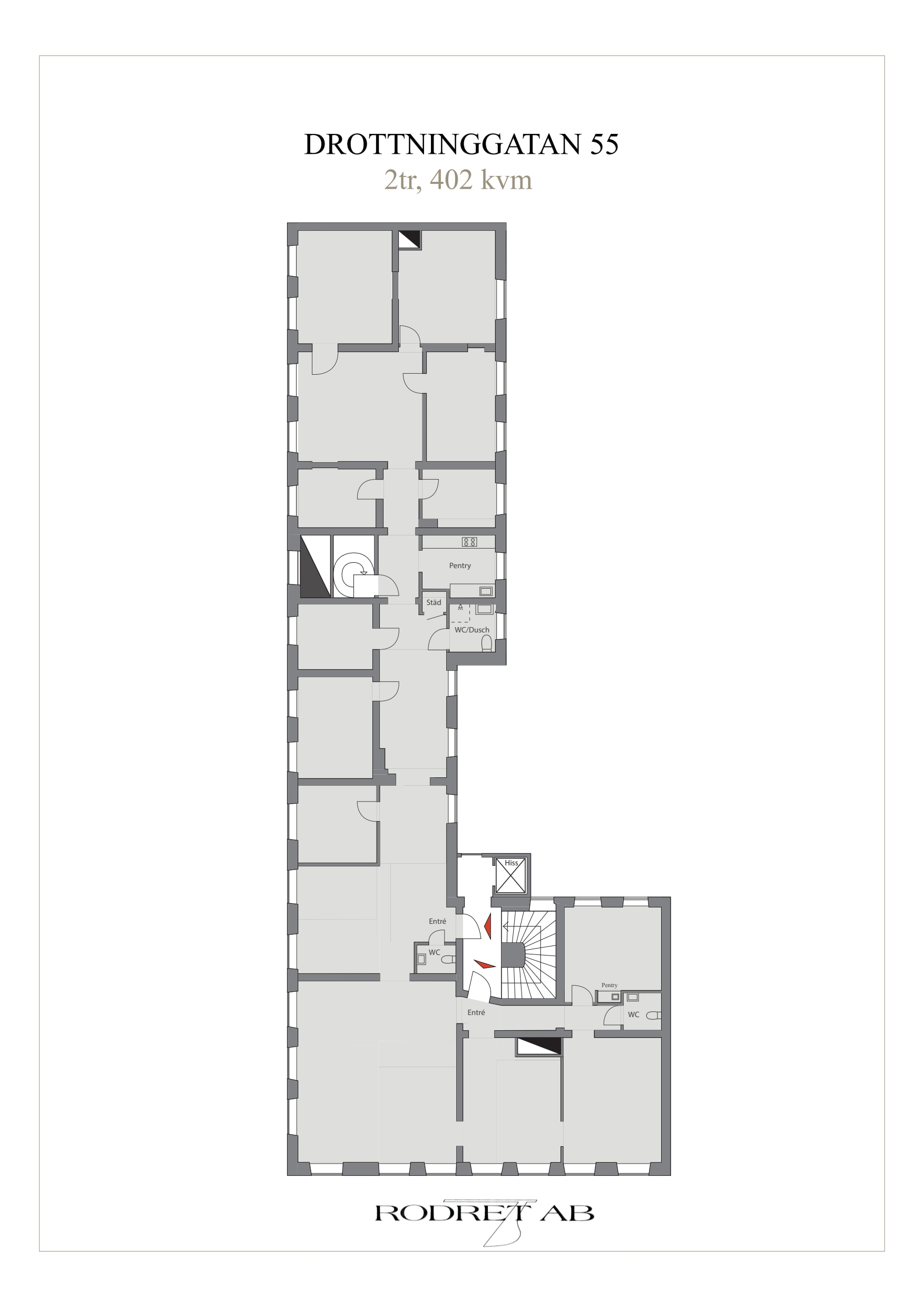 Lokalen ligger på plan 2 i fastigheten, korsningen Drottninggatan/Bryggargatan. Lokalen är uppdelat i mestadels större rum samt ett större landskap i hörnan Drottninggatan/Bryggargatan. Ett stort öppet utrymme finns i mitten av lokalen som blir hjärtat med pentryt och allmännyttor intill. Möjlighet till bra extern del. Det finns totalt 3 toaletter samt ett separat utrymme med dusch.