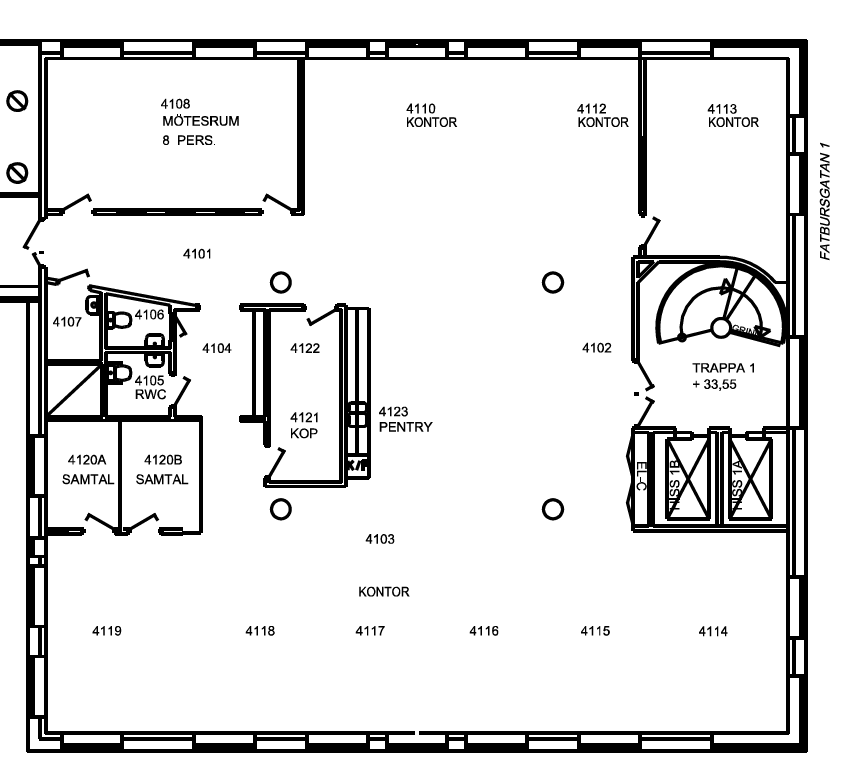 Välkommen upp till våning 4. Här möts ni av en representativ och flexibel yta skapad för dagens moderna arbetssätt. Planlösningen är öppen och inbjudande, vilket främjar samarbete och kreativitet, samtidigt som det finns utrymme för fokus. Den täta fönstersättningen fyller lokalen med dagsljus och skapar en energi som känns i hela kontoret.