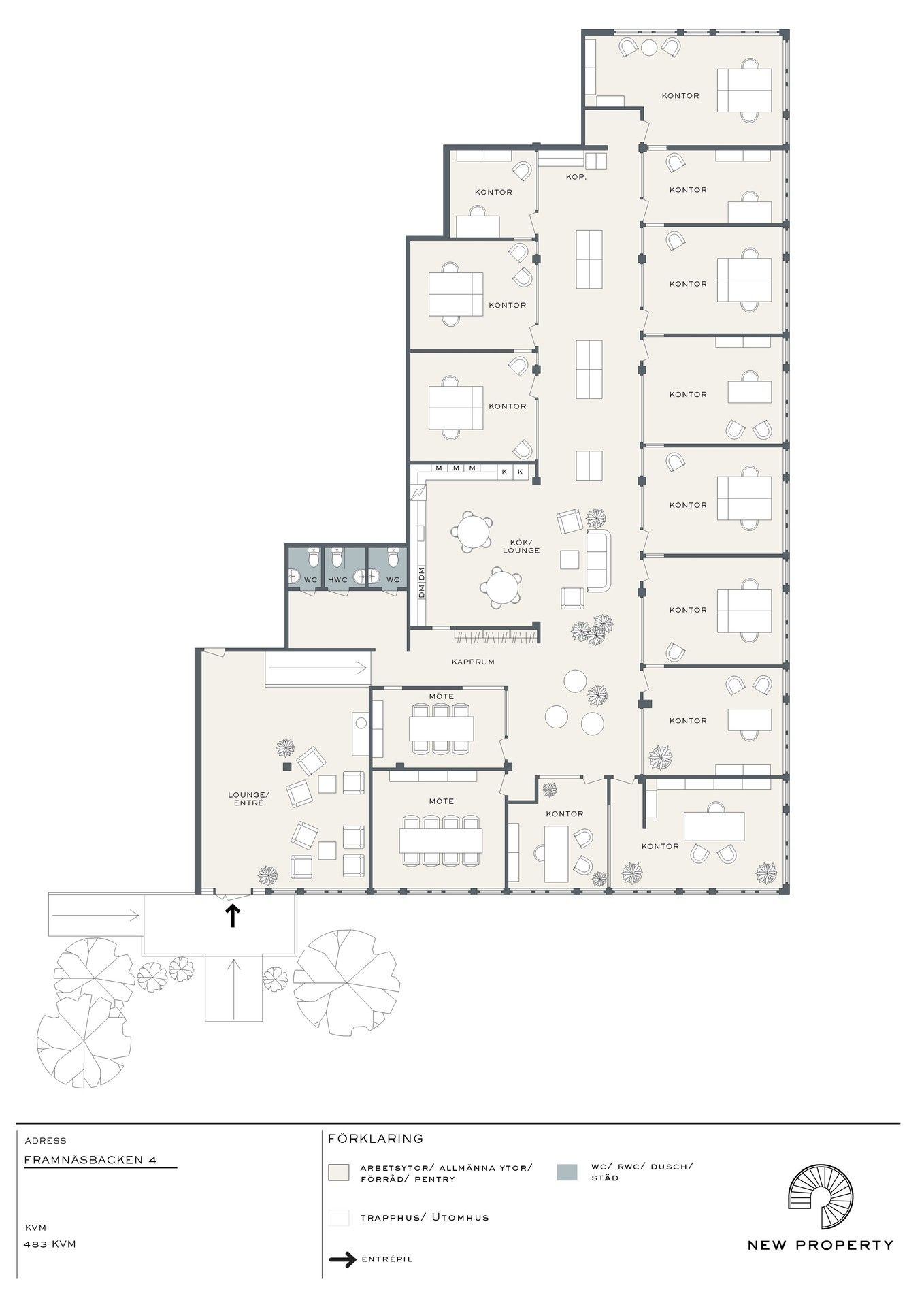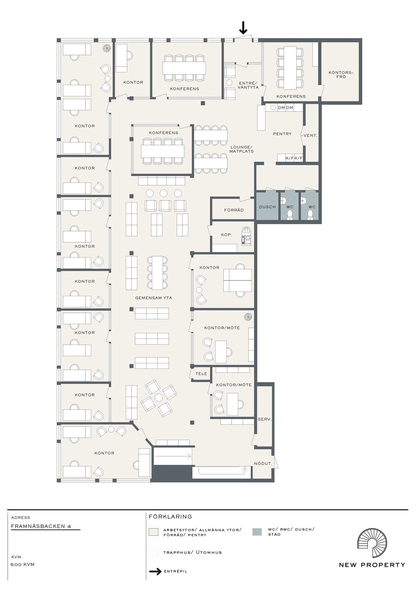 Lokalen fördelar sig på två snarlika plan (438 + 500 kvm) med egna entréer. Per plan ser rumsfördelningen ut som följer;