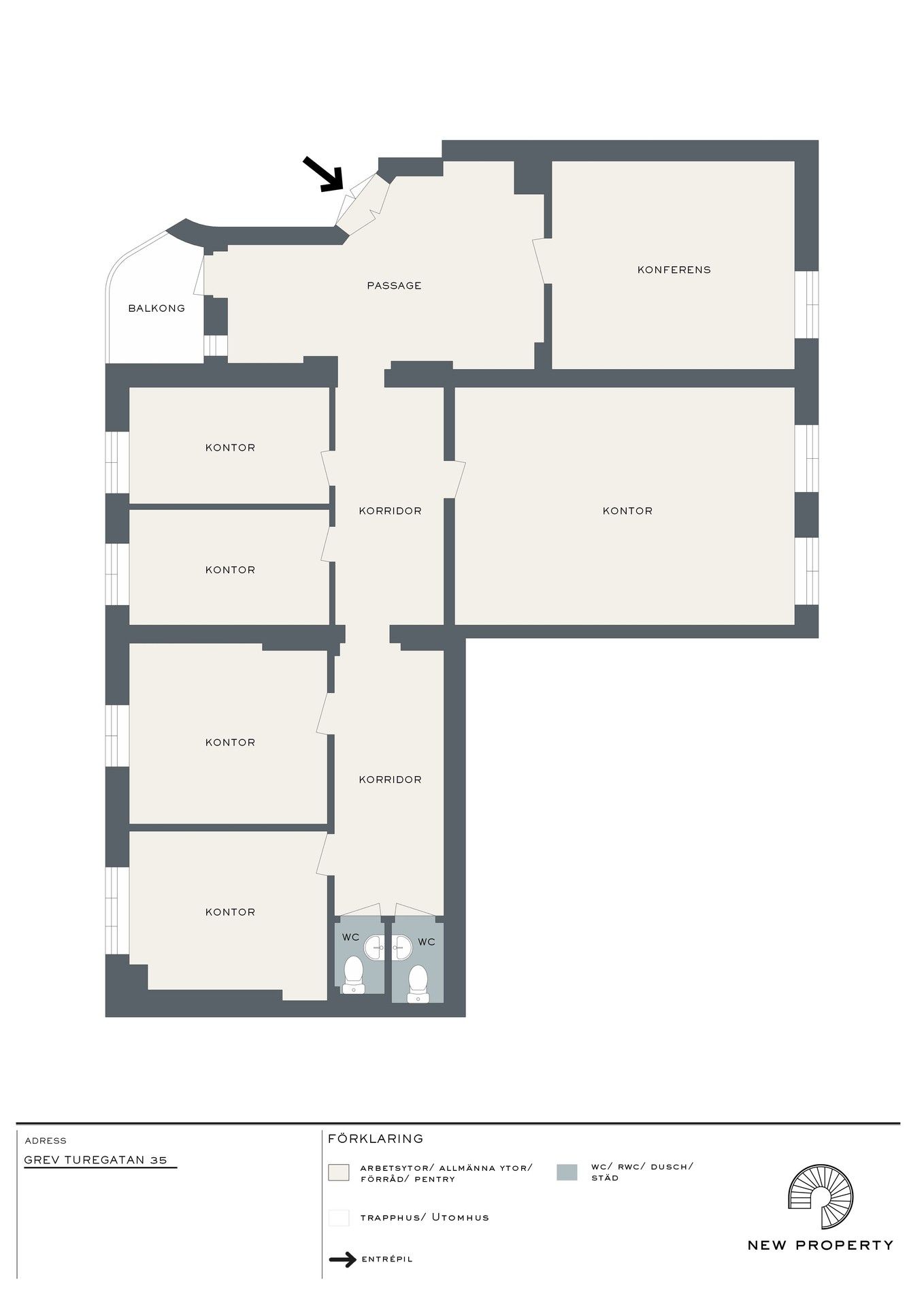 Genomgående lokal med 2 bra konferensrum och 4 bra arbetsrum. Längst in i lokalen finns två trevliga toaletter.