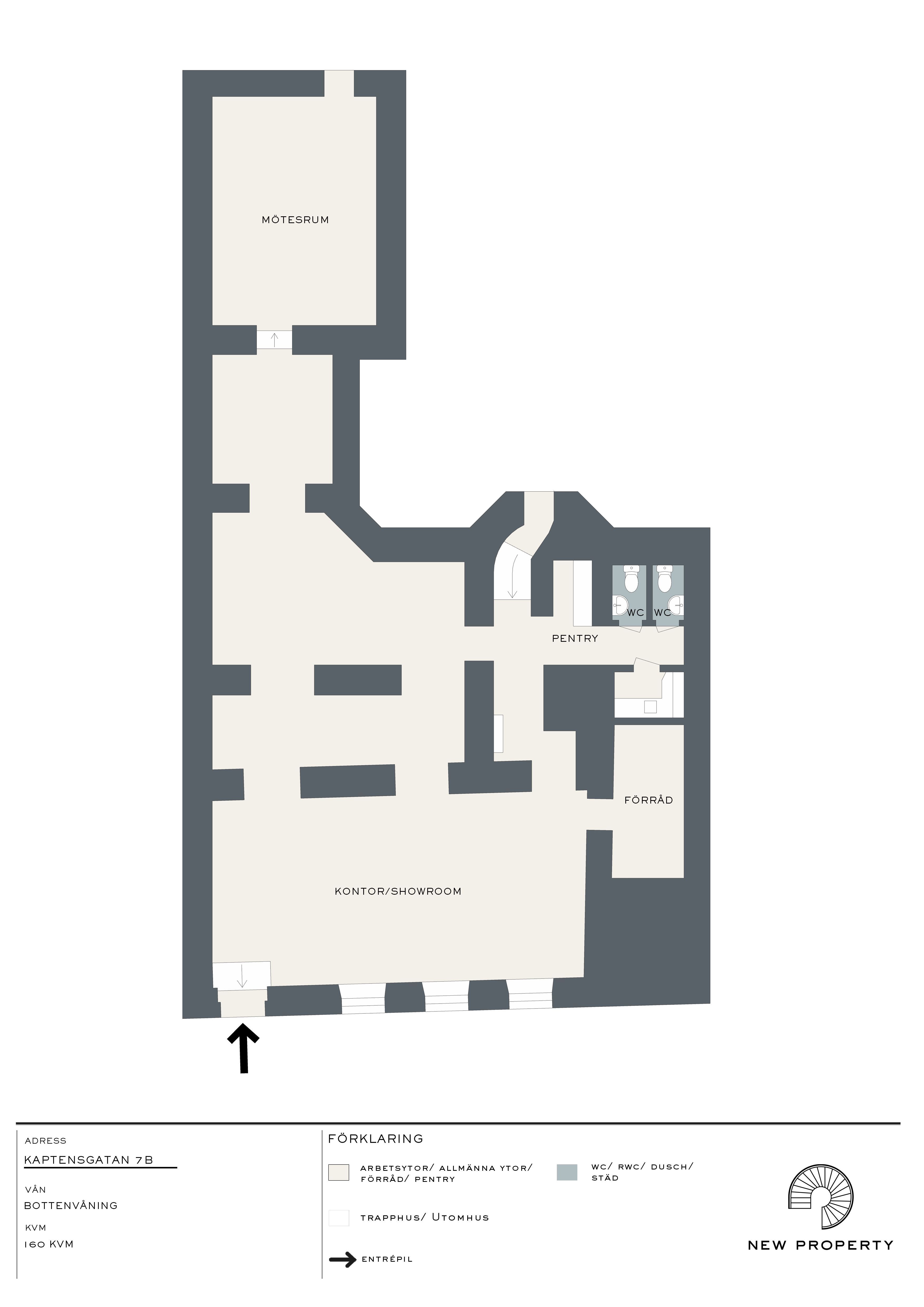 Lokalen ligger på souterrängplan och erbjuder en genomtänkt rumsindelning som skapar naturliga zoner för showroom, kontor och lager, allt under ett tak. Den egna gatuentrén ger ett representativt och välkomnande intryck och gör lokalen enkel att nyttja för olika typer av verksamheter.