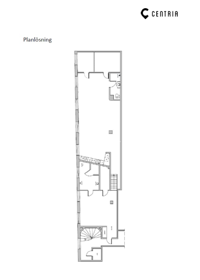Planlösning: Lokalen är utformad med tre kontorsrum i olika storlekar, en öppen kontorsyta, pentry, ett förråd samt två WC varav den ena med dusch och bastu.