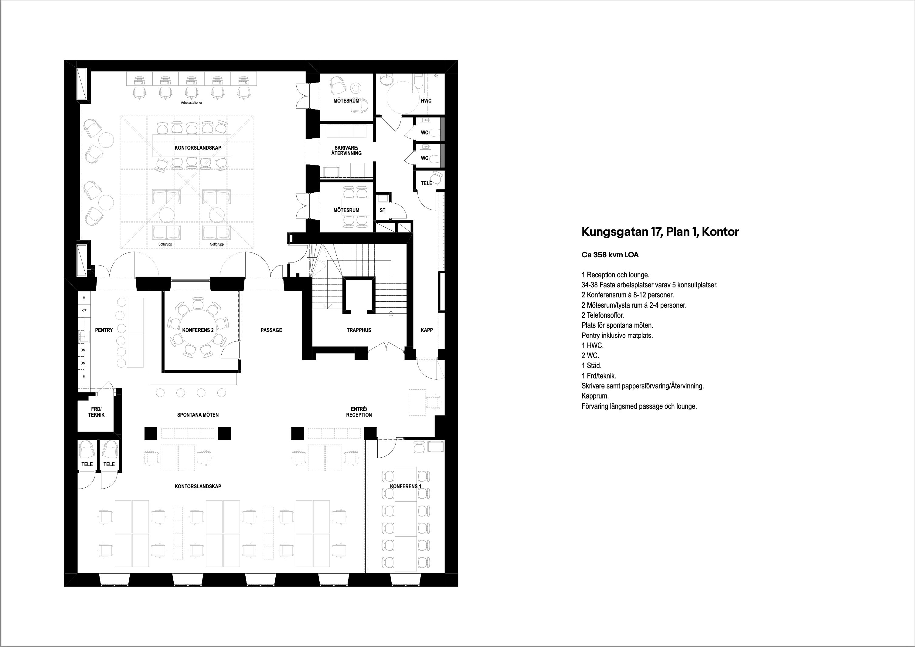 Välkommen till denna representativa lokal om 358 kvm, belägen en trappa upp i en byggnad ritad av Ivar Tengbom. Lokalen erbjuder generösa arbetsytor – den ena med utsikt över Kungsgatan och den andra med ett stort glasatrium som ger fantastiskt ljusinsläpp. Lokalen är extremt yteffektiv och lämpar sig för ca. 40 arbetsplatser!