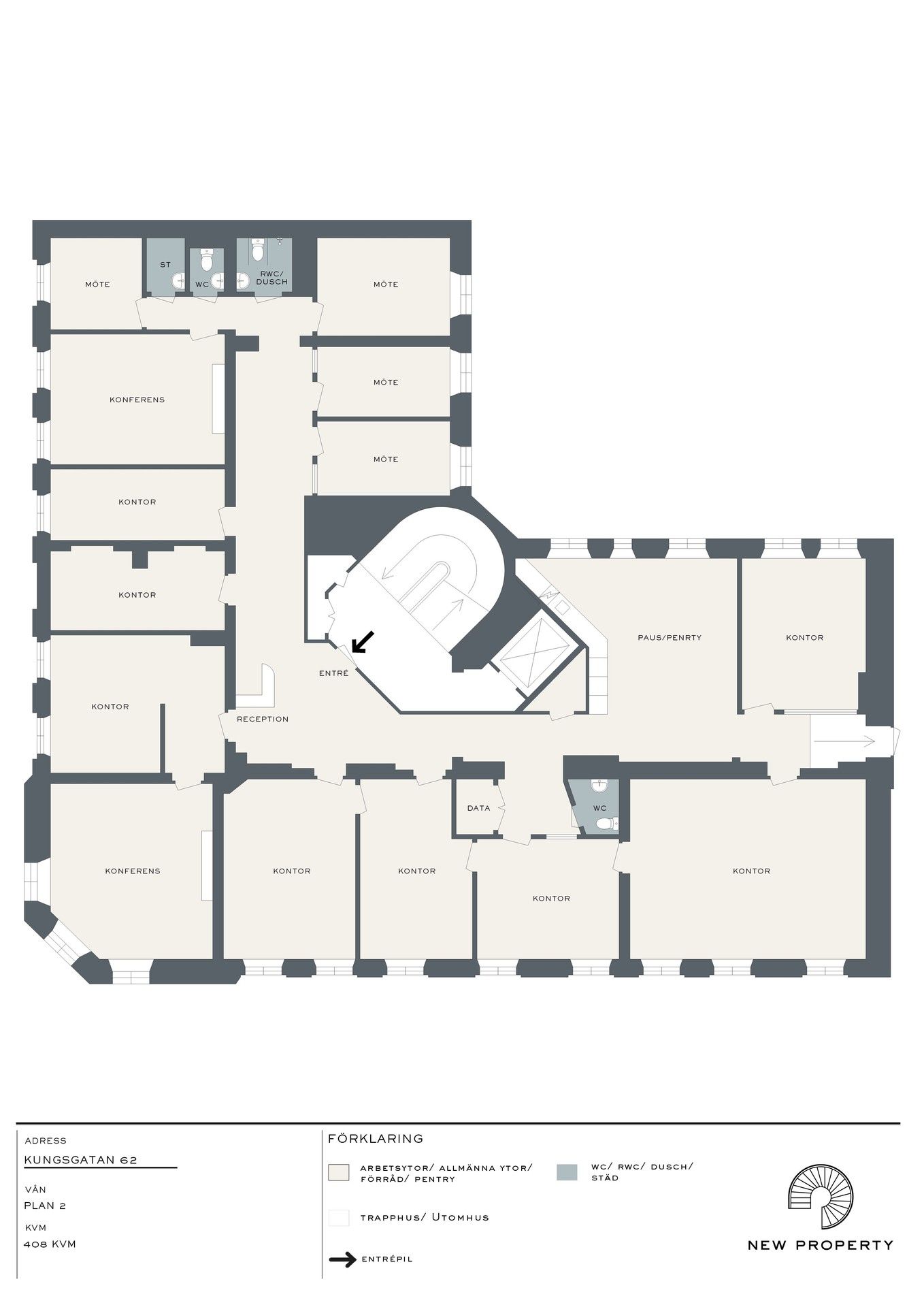 Denna lokal har ett ljust hörnläge mot Kungsgatan och Klara Norra Kyrkogata. Bra mix av mötesrum och arbetsrum i olika storlekar.: Ett större rum lämpligt för föreläsningar av olika slag.: Kontoret är i gott skick och de tre toaletterna är nyrenoverade. Dusch finns också.
