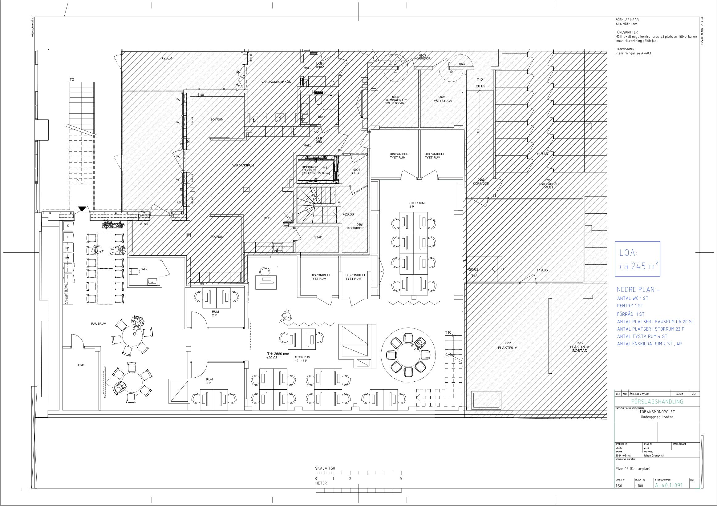 En trappa ner öppnar sig en större yta som passar perfekt som arbetsplats, kompletterad med interna rum och ett pentry. Lokalen erbjuder goda möjligheter till anpassning av både planlösning och ytskikt för att skapa en miljö som passar er verksamhet.