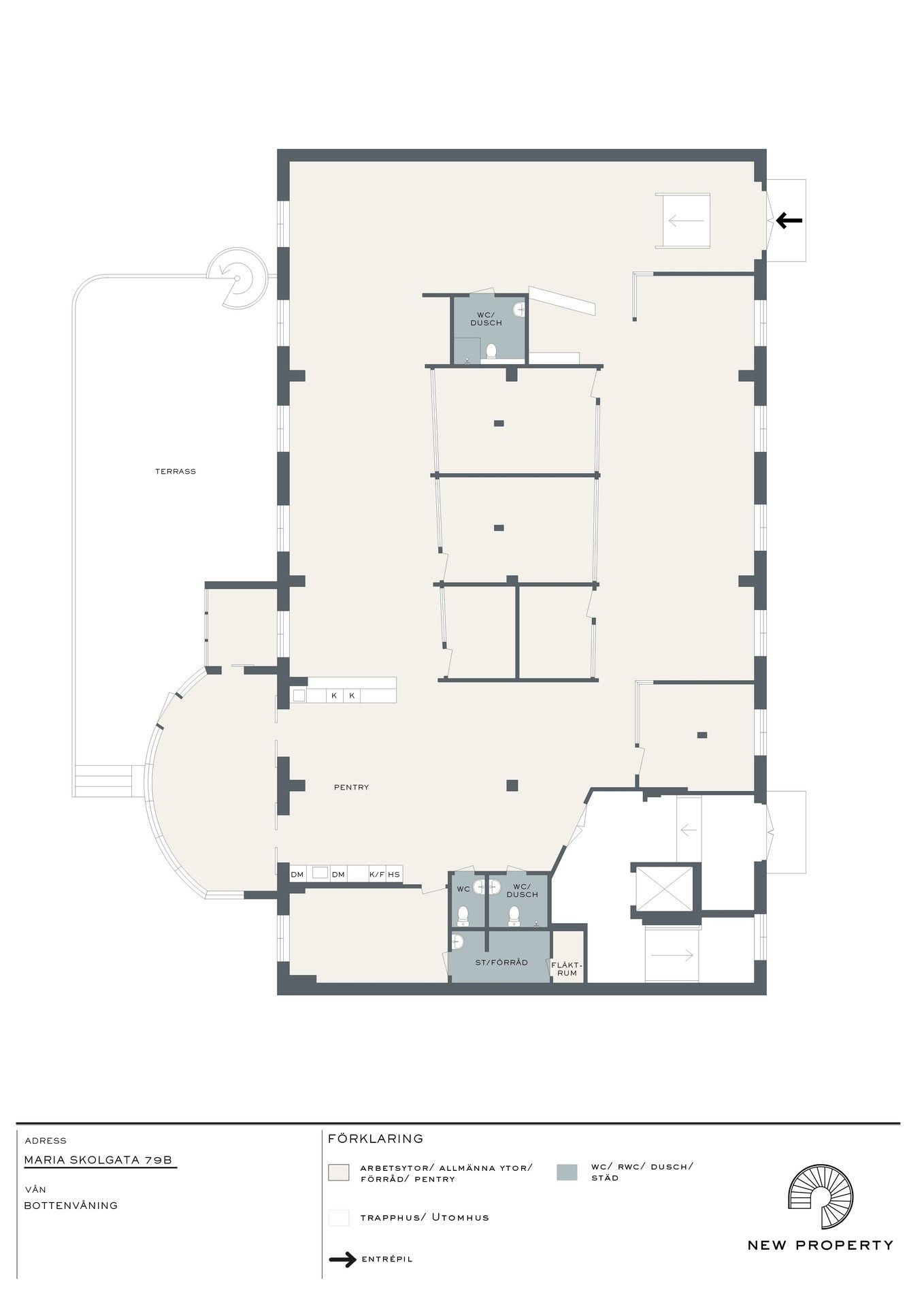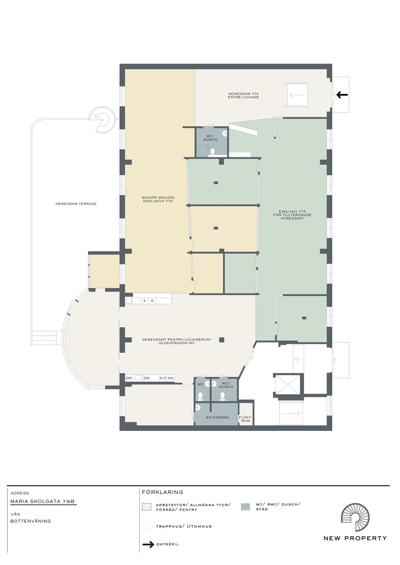 Från ingången, direkt från gatan, möts man av en härlig lounge och mottagningsyta. Stor öppen arbetsyta med fönster ut mot Maria Skolgata med plats för upp till ca 20-22 personer. Ett större konferensrum för upp till 8-10 personer, ett mindre mötesrum för 3-4 personer samt ytterligare ett arbetsrum för upp till 4 personer. Stort gemensamt pentry med en tillhörande glasveranda med direktutgång till 80 kvm terass i soldränkt läge. 3 wc totalt i lokalen varav 2 med dusch.