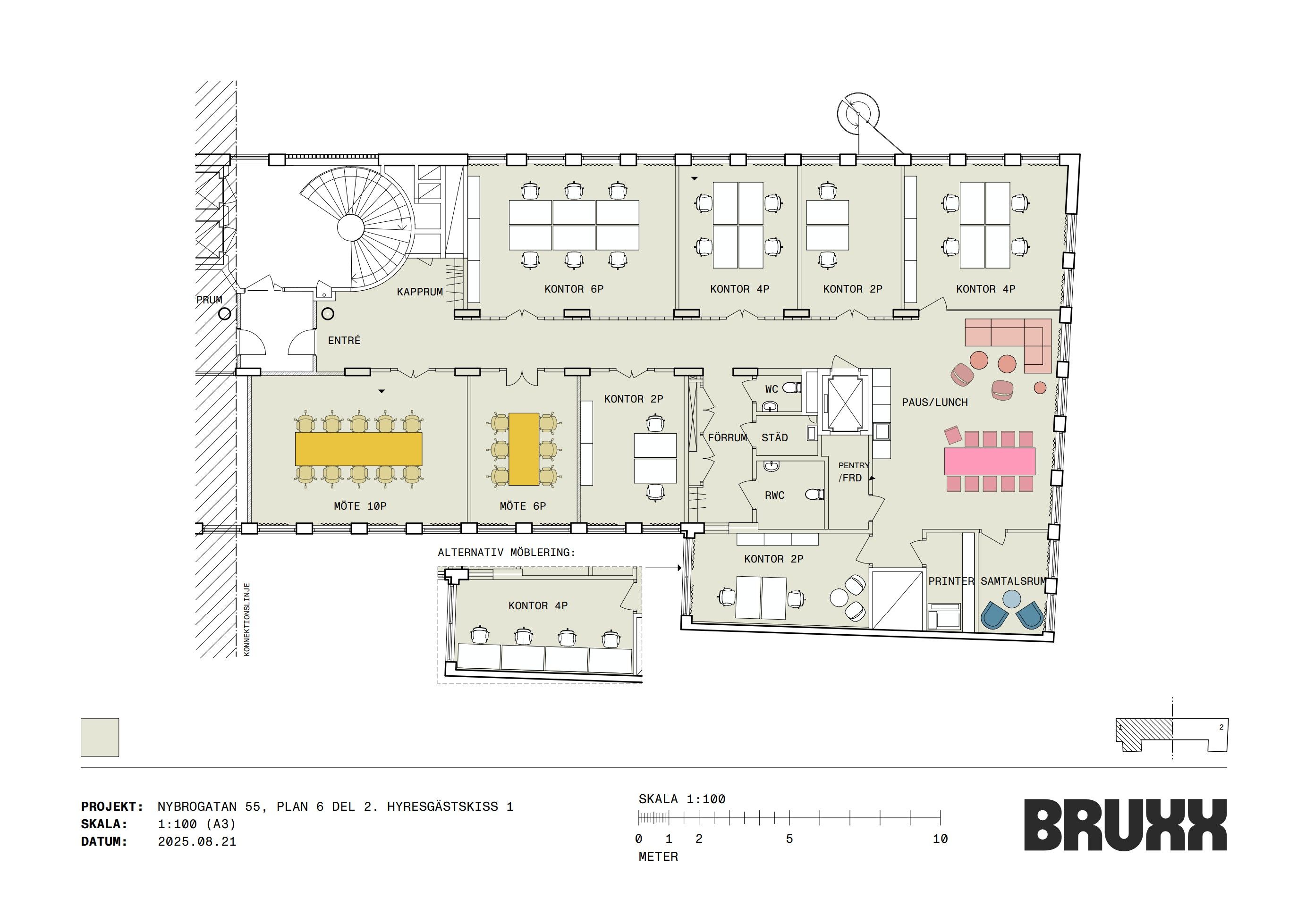 Ett mycket påkostat kontor med putsade betongväggar, rostfria fondväggar och mycket exklusiva mattor. Den välkomnande entrén ligger i början av lokalen, följt av storrumskontor och blandade storlekar på mötesrum. Idag har lokalen ca 46 arbetsplatser men går att förtäta upp till ca 55 arbetsplatser. Entrén till huset har en trevlig lounge och i källarplan finns det ett medlemsgym. Garage finns, platser hyrs ut via Parkando.: En lokal som måste ses! Välkomna på visning! Hela huset totalrenoverades 2022.