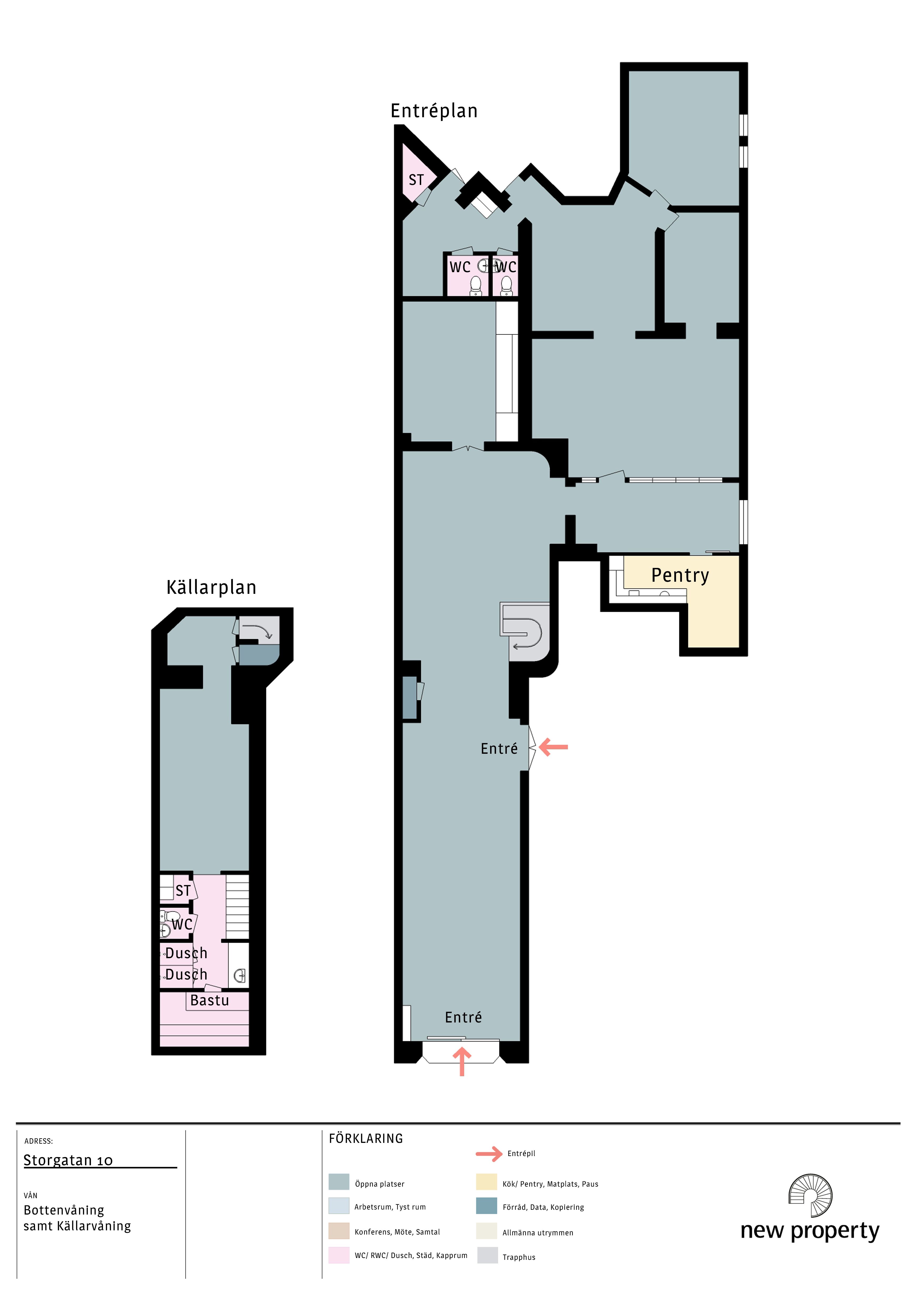 Entréplanet är ca 342 kvm och källarplanet ca 66 kvm. Lokalen har både egen entré från gatan entré via trapphuset. Stort skyltfönster mot Storgatan.: I entréplanet är det högt i tak och gott om ljusinsläpp via takfönster och sidofönster. Påkostad inredning och belysning.: Lokalen har en stor öppen yta vid entrén som kan fungera som öppet landskap eller kan användas som showroom eller butiksdel.: I den bakre delen av lokalen finns två stora rymliga konferensrum, ett mindre arbetsrum och en öppen del för arbetsplatser. Här finns också ett trevligt genomgångsrum som idag fungerar som bibliotek. Pentry med gott om pausplatser.: Källardelen är ca 66 kvm och fungerar idag som gym och här finns duschar, wc och bastu.