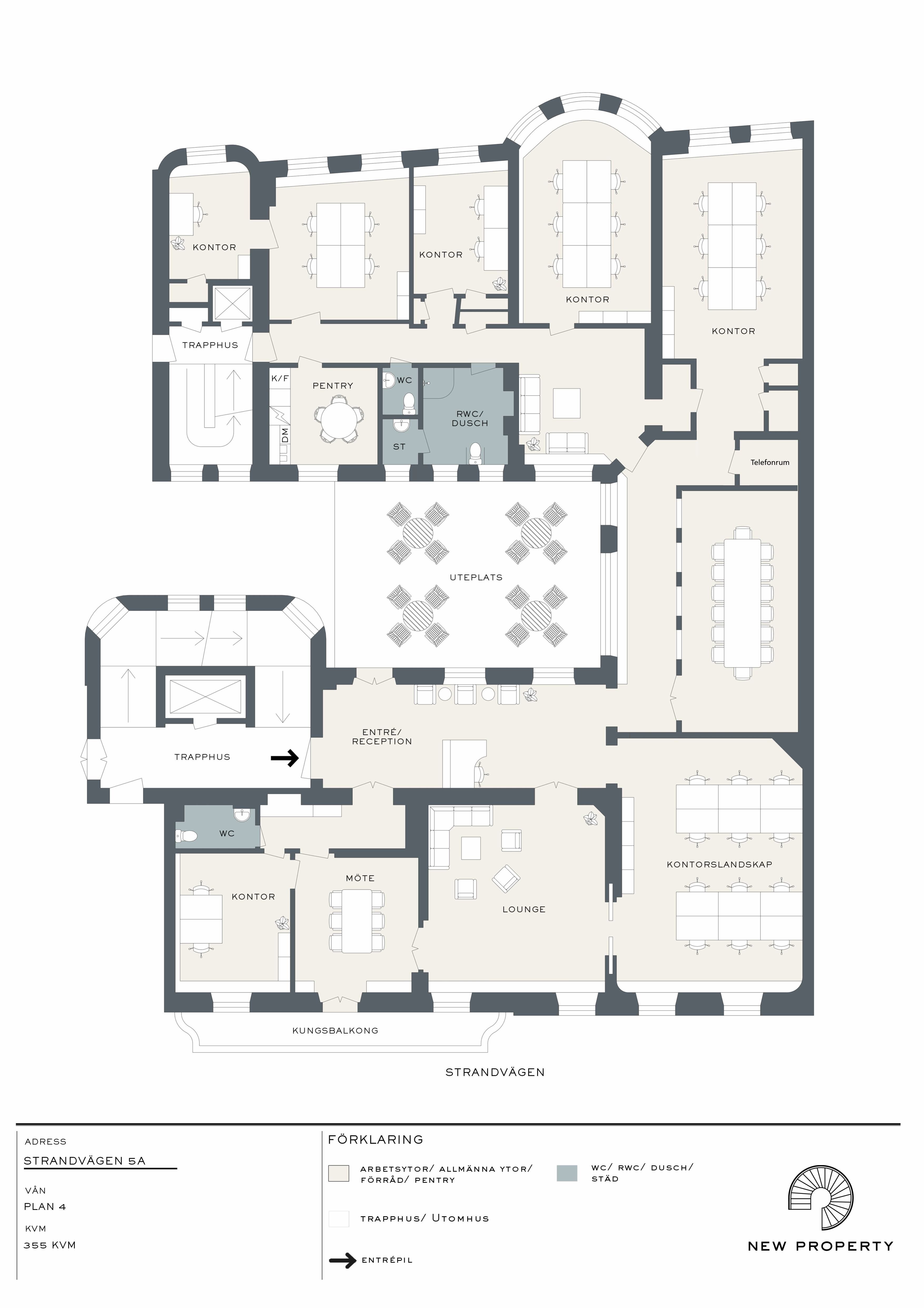 Hiss, Parkering: Närliggande parkeringshus i området, Att ha Strandvägen som bas innebär att ni befinner er i händelsernas centrum men med ett lugnt och exklusivt fokus. För affärsluncher och representation finns Stockholms bästa utbud av restauranger precis utanför dörren. Fastigheten erbjuder även en trivsam innergård för medarbetarna, en sällsynt oas mitt i city.