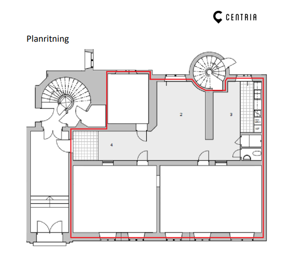 Planlösning: Planlösningen är i dagsläget rumsindelad med två större kontorsrum, ett mindre mötesrum samt en loungedel. Till lokalen hör ett pentry och två WC.