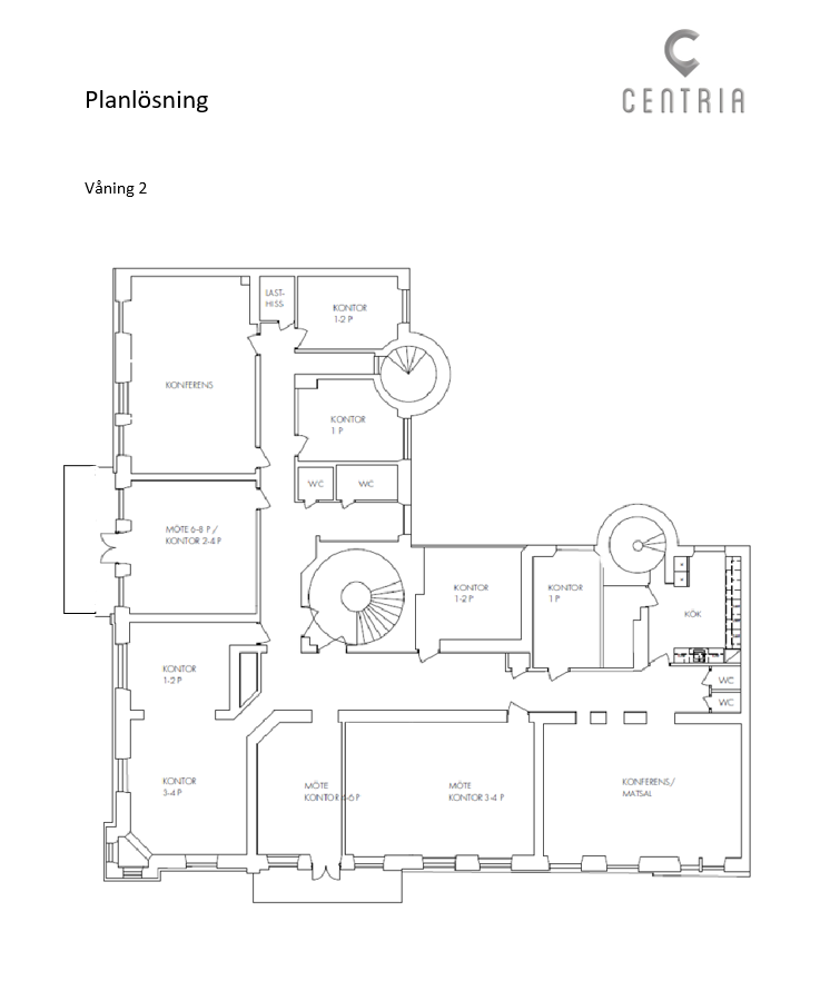 Planlösning: Lokalen disponerar mötesrum och kontorsrum i olika storlekar, fyra WC samt ett pentry. Dubbla balkonger.