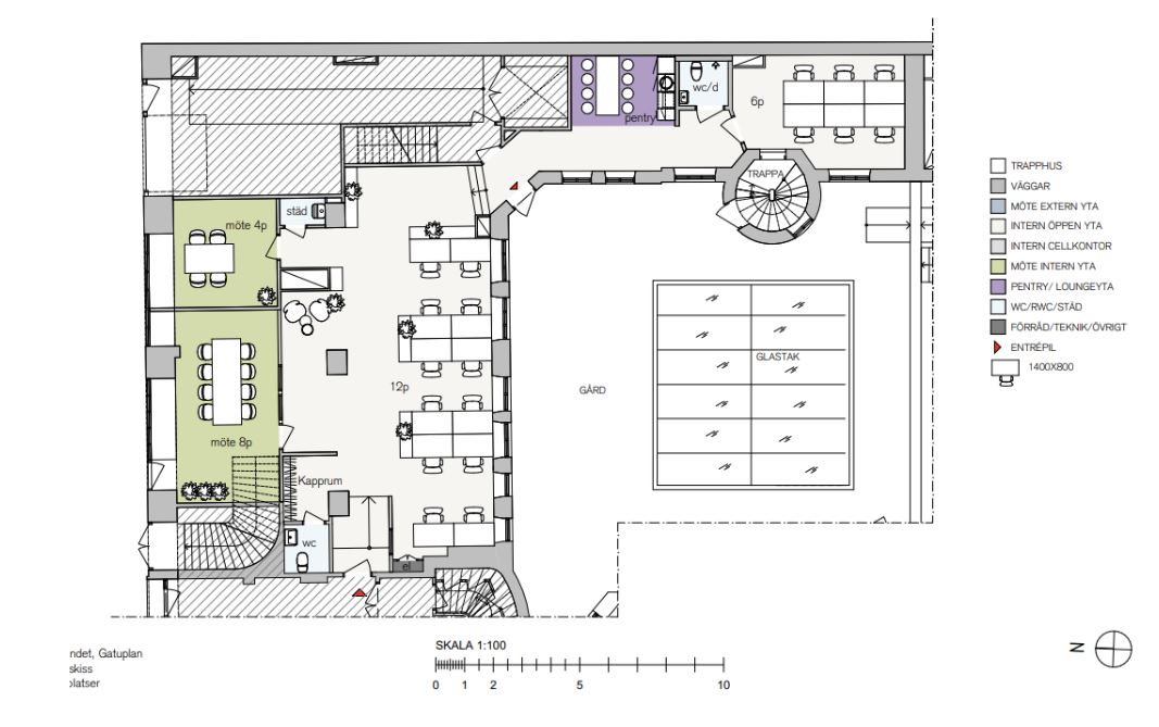 På Gatuplan återfinns denna rymliga lokal om 192 kvadratmeter. Lokalen erbjuder ett öppet kontorslandskap med tilIgång till två mötesrum i olika storlek, samt pentry. Två entréer varav en från trapphuset och den andra från gården.